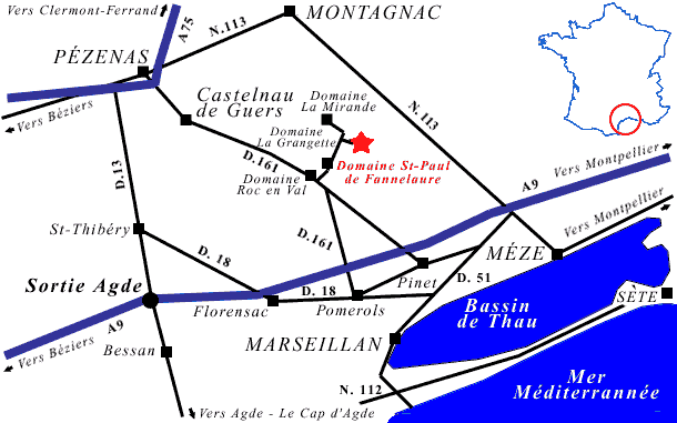 Autouroute A 75: Sortie Pézenas Sud; direction Castelnau de guers par la D 32 E. Traverser Castelnau et à la sortie prendre la D 161 direction Pomerols.